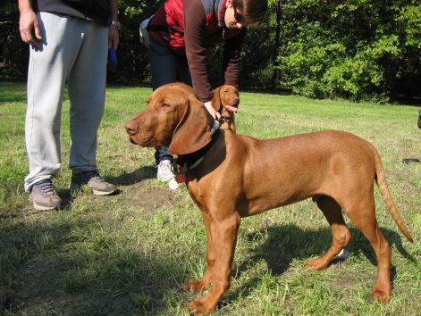 Rozi tűri kelletlenül, hogy póráz kerüljön rá, amíg egy kutyás csapat elhaladt mellettünk. A csapat nagyon jól viselte a többi kutya jelenlétét, pedig voltak ám nagyon sokan kint, de mindenki ügyesen viselkedett.