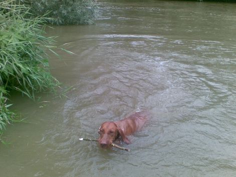 Még mielőtt bedobtuk volna neki a botot, beugrott egy lepke után a vízbe. El is neveztük lepkevadásznak Vandát a kirándulás idejére.