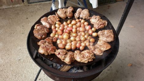 Itt már sülnek a csirke combok, csirke mellek, cukkínik, répák, kis krumplik, kolbászkák a tárcsán, illatuk csiklandozzta a kutya és ember orrokat egyaránt. Az ízek pedig, hát arra nem lehet szavakat találni, mennyire finom volt minden. A meghívást ezúton is köszönjük Juditnak és Lalinak (Dió családjának), Isteni finom ételeket készítettek azon a szerkezeten (amiből azóta már mi is beszereztünk egyet ;-)), nagyon jól éreztük magunkat.